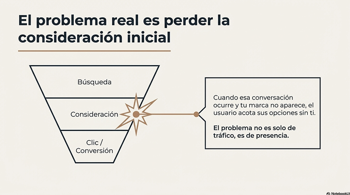 Cada vez más usuarios consultan a ChatGPT antes de visitar una web, antes de pedir presupuesto y antes de comparar proveedores. Cuando esa conversación ocurre y tu marca no aparece, el problema no es solo de tráfico. El problema es de pérdida de presencia en el momento en el que empieza la consideración.