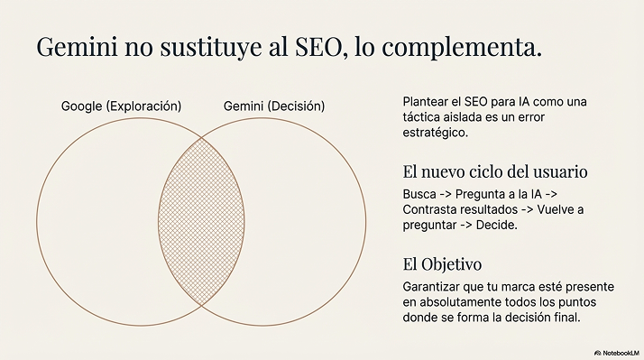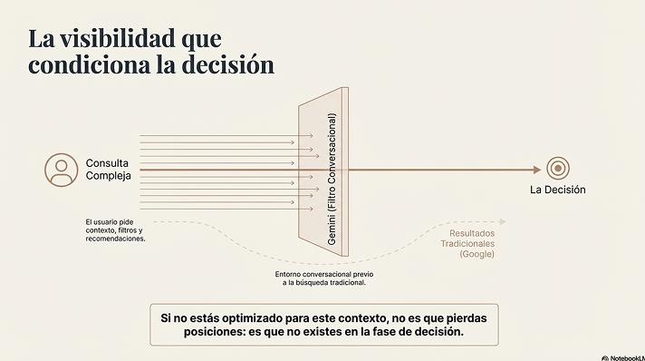 El usuario ya no sigue un único camino. Busca, pregunta, contrasta, vuelve a preguntar y decide. Gemini entra antes del clic, de la comparativa, del contacto.